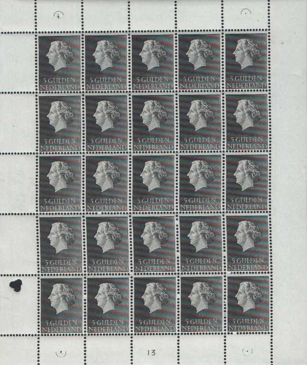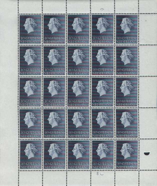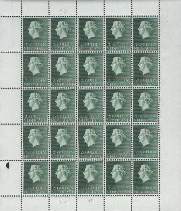 Velletjes van 25 stuks van de Juliana serie 1954: 2½ gulden, 5 gulden en 10 gulden